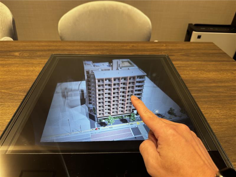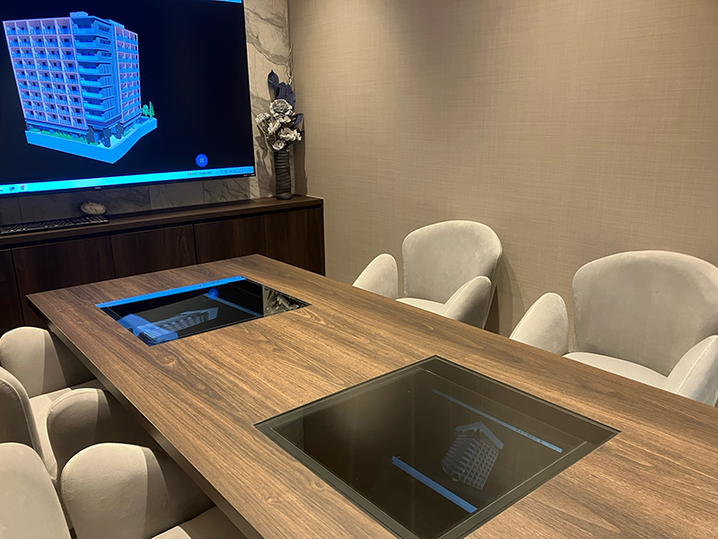 商談室において、新築マンションの模型を空中に投影する空中ディスプレイとしてASKA3Dをご導入いただきました。空中ディスプレイにより手元に投影された模型は拡大や回転など指で動かして確認することが可能です。お客様の物件理解度を向上させるのみならずマンションの模型をデジタル化することで、循環型社会の実現に貢献することをご期待いただいております。